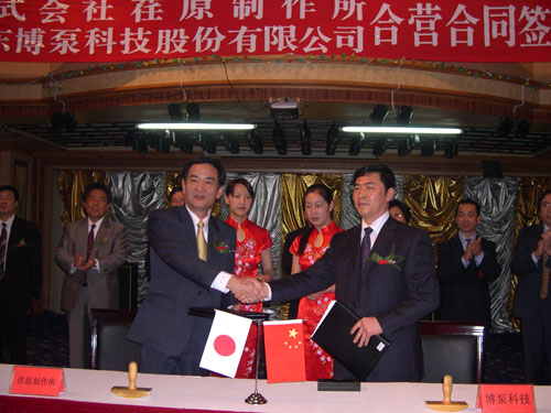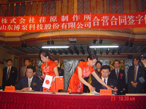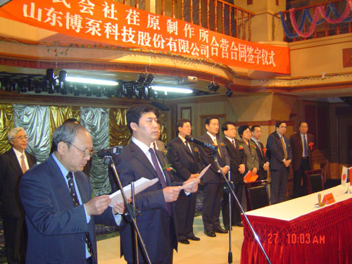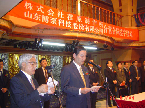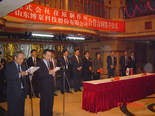 新聞中心 2005年4月27日,在博山萬(wàn)杰國(guó)際大酒店山東博泵科技股份有限公司與日本株式會(huì)社荏原制作所正式簽署了注冊(cè)資本1100萬(wàn)美元的合營(yíng)公司――荏原博泵有限責(zé)任公司。該公司的建立將通過引進(jìn)世界最大的泵企業(yè)――日本株式會(huì)社荏原制作所的先進(jìn)技術(shù),加快大型泵、高壓泵國(guó)產(chǎn)化進(jìn)程,建成具有國(guó)際競(jìng)爭(zhēng)力的一流企業(yè)。為中國(guó)水電、核電及超臨界火電項(xiàng)目,為南水北調(diào)等大型水力工程提供高質(zhì)量、高技術(shù)含量的一流泵產(chǎn)品,提升中國(guó)機(jī)械工業(yè)技術(shù)、質(zhì)量水平,促進(jìn)產(chǎn)品更新?lián)Q代,為中國(guó)電力、冶金、水力事業(yè)的發(fā)展乃至中國(guó)國(guó)民經(jīng)濟(jì)的發(fā)展做出應(yīng)有的貢獻(xiàn)。